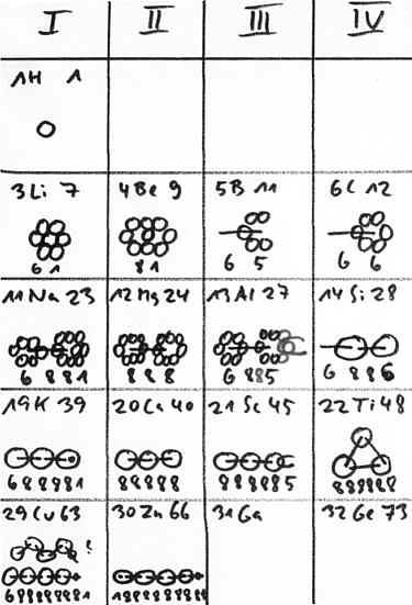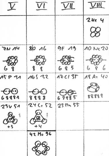 Die auf Titan folgenden Elemente Vanadium und Chrom sind diesem ähnlich aufgebaut, enthalten aber möglicherweise noch zusätzlich einen zentralen Tritium- bzw. Heliumkern. Bei den Elementen der Eisengruppe