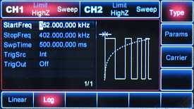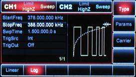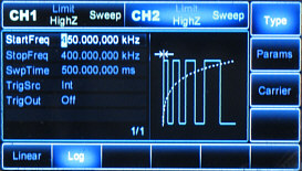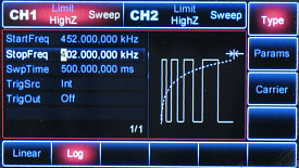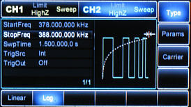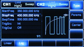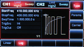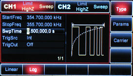 verändert werden muß, was insgesamt 3 Sweepfrequenzbereiche ergibt: 1.) 350KHz bis 300KHz, 2.) 350K - 400 KHz und 3.) 450K - 400KHz für den einen Kanal (hier: CH 2) und ca.1Hz- 2