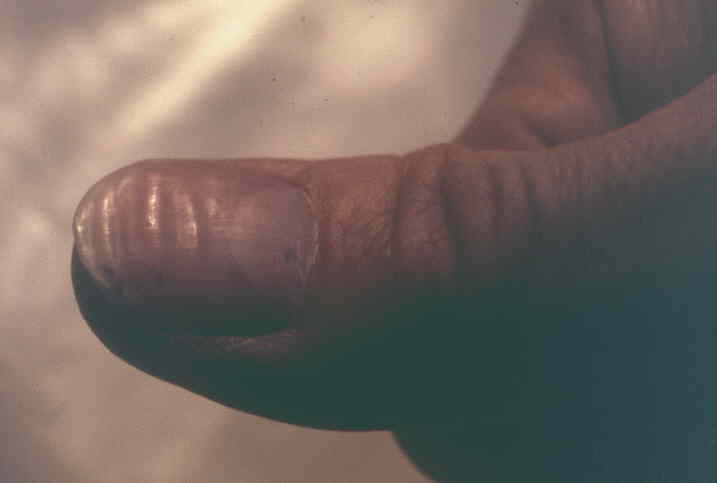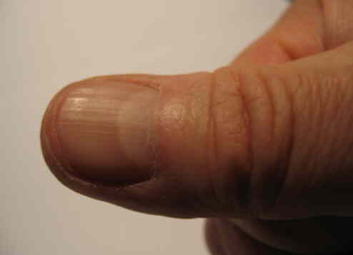 Weitere schon früh beobachtbare Symptome Waschbrettartig geriffelte Daumennägel als Folge des periodischen Infektionszyklus (“Jahresringe”) und verschiedenartige