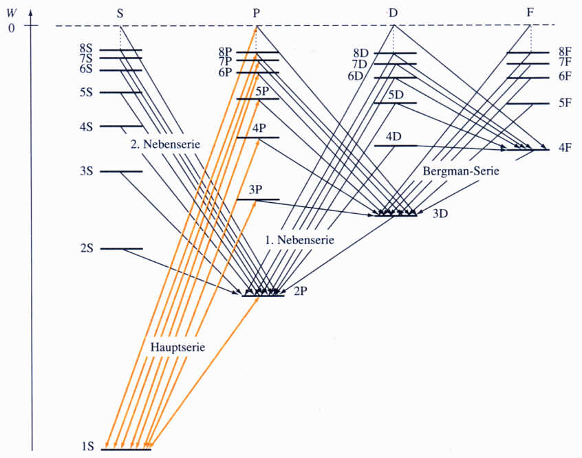 in einem früheren Erklärungsmodell mit als Photonen abspringenden Elektronen zu gleichen Energieniveaus im Termschema führen sollte.