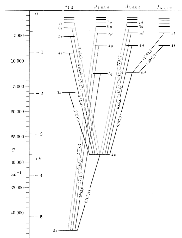 zu gleichen Energieniveaus aufgehoben ist. So fallen beim Lithium und den anderen Alkaliatom-Spektren etwa die Zustände 1s und 2p, 3s, 3p und 3d