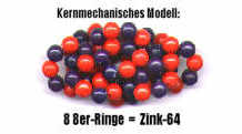 Ganz ähnlich liegen die Verhältnisse auch “beim Zink-64, wo sich die acht Kernringe zwangsläufig zu einem langgezogenen Rhombus ordnen,