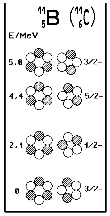 Besonders interessant und unerwartet ist nun der Grundzustand von C-12 (Fig. 4, ganz unten), wo sich eben gerade nicht zwei Neutronen