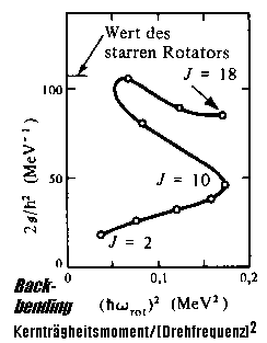 naiv-abstrakten Alpha-Cluster-Modell - weiterhin auch noch die mittel-/schweren und superschweren Kerne und erklären z. B. den “Backbending-Effekt”, d. h. die plötzliche Zunahme des Trägheitsmoments etwa beim Erbium, nun rein mechanisch dadurch, daß hier eine längere geschlossene und zusammengerollte, aus vielen einzelnen Kernringen bestehende Kette bei zunehmender Rotation durch die Fliehkraft plötzlich auseinandergezogen wird (4, s. o., S. 4).