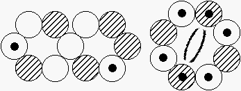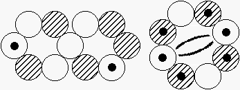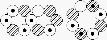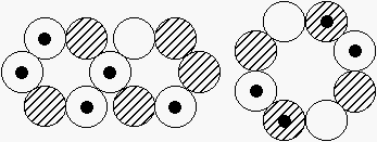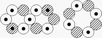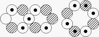 einfachen nunmehr aus Stabilitätsgründen nebeneinander liegen (was umgekehrt die verminderte Stabilität von C-14, mit gegenüberliegenden ungesättigten Protonenorbitalen, erklärt!). C-12 und ebenso O-17 bestehen aus zwei Li-6-Kernringen, welche bei O-17 jedoch zu einer “liegenden Acht” verschmolzen sind; jetzt aber - im Gegensatz zu F-19 ff. - mit alternierender(!) Anordnung der Nukleonen in den Kernringen. Nun stimmen (s. oben) sowohl Kernspin (I = 1/2 pro ungepaartes Nukleon) und Dipolmomente als auch die Quadrupolmomente (nur mit zentralem Dipolmoment bei O-17 ist letzteres negativ!). - Problematisch scheint allein die bei allen gg-Kernen erforderliche Spinpaarung zum Kernspin Null, insbesondere beim sehr wichtigen O-18-Nuklid; vergl. Supraleitung!