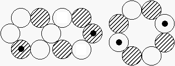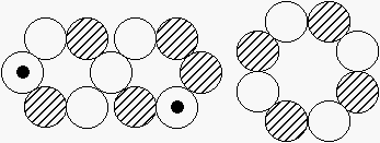 Weiterhin sieht man, daß bei den Nukliden Na-21 bis Na-24 die beiden doppelten Protonenorbitale - soweit wie möglich entfernt - zunächst gegenüber in die liegende B-11-Acht eingebaut werden. Von Na-25 ab bis zu Al- und Na-27(29) scheint dann der bereits teilweise mit doppelten Neutronenorbitalen bestückte 8er-Ring offenbar energetisch vorteilhafter, während ganz am Ende bei Na-31 (mit vollständig doppelt besetzten Neutronenorbitalen) wieder die liegende (B-11-)Acht den Vorzug vor dem Be-8-Ring erhält.