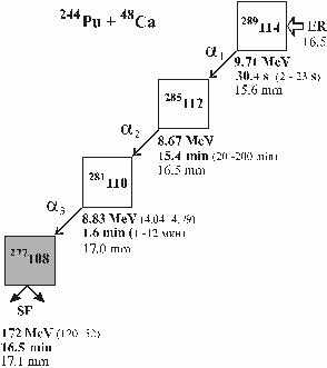 Genau die richtige Länge hatte demgegenüber aber offenbar die Nickel-64-Projektilkette, welche bereits im Dezember 1994 bei der Darmstädter GSI auf ein Bi-209-Target geschossen wurde und zur erfolgreichen Synthese von Element 111-272 führte, welches dann nach etwa zwei Millisekunden zunächst in das Element 109-268 zerfiel und dieses dann wiederum in das mit fast 1,5 Sekunden Korrelationszeit schon relativ stabile Element 107-264.