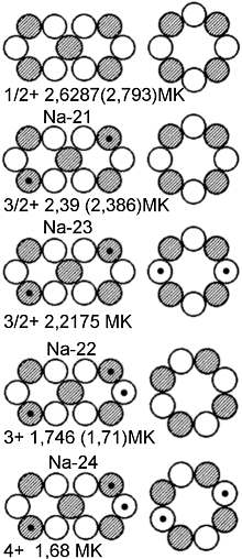 ähnlich verhält es sich bei Na-22 (sowie Na-24), wo ganz außen in der B-11-Struktur jeweils noch ein doppelt besetztes Neutronen-Orbital hinzu