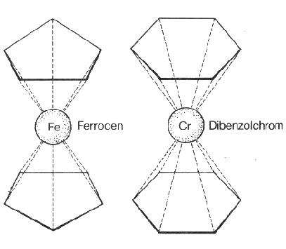 zwei sechseckigen Benzolgruppen - spricht, während wiederum Eisen eine “Ferrocen”-Verbindung mit dem fünfeckigen Cyclopentadien bildet.