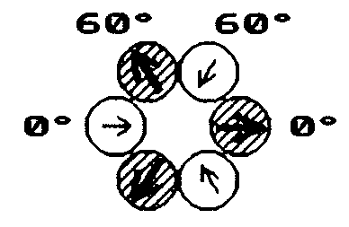 Beim Graphit und beim Benzol verhält es sich bekanntlich anders, da hier die Elektronen der Orbitale B, C sowie A (welches sich gegenüber der gezeichneten Anordnung nun auf der anderen Seite des Atomkerns befindet) drei “Sigma”-Bindungen betätigen, während das vierte quasifreie Elektron A’ in der Zeichnungs- bzw. Molekül-Ebene (bei Benzol) gepaart oder (bei Graphit) ungepaart für die “Pi”-Bindungen zuständig ist.