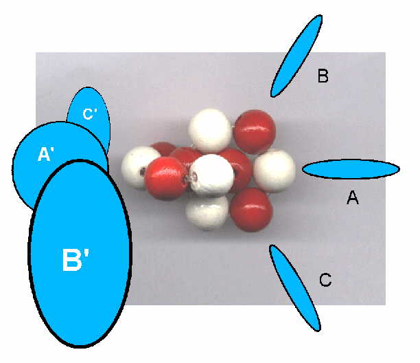 denen sich Elektronen aufhalten können. Jedem der beiden (senkrecht zueinander stehenden) Kernringe sind dann drei Orbitale A, B und C, bzw. A’, B’ und C’ zugeordnet.