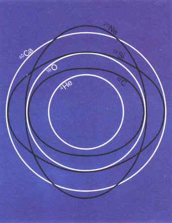 C-12-Struktur (alle Kernring-Orbitale sind nun doppelt besetzt). Jedoch ist die - auf Grund der gemessenen zylindrischen Kernform - lange favorisierte Struktur aus drei 8er-Kernringen so fragil, wie man das eigentlich vermuten