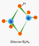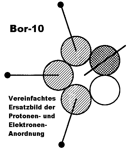 zusammengesetzten Diboran, einer sogenannten Elektronenmangel- oder Dreizentrenbindung, wo sich zwei Wasserstoffatome ihr Elektronenpaar mit den Boratomen teilen. Tatsächlich m u ß das Kernmechanische Modell ja nun auch erklären, wie es möglich ist, daß das gänzlich anders aufgebaute Boratom dennoch nach Art des Kohlenstoffs vier “annähernd” in die Ecken eines Tetraeders weisende Bindungen zugleich bedienen kann